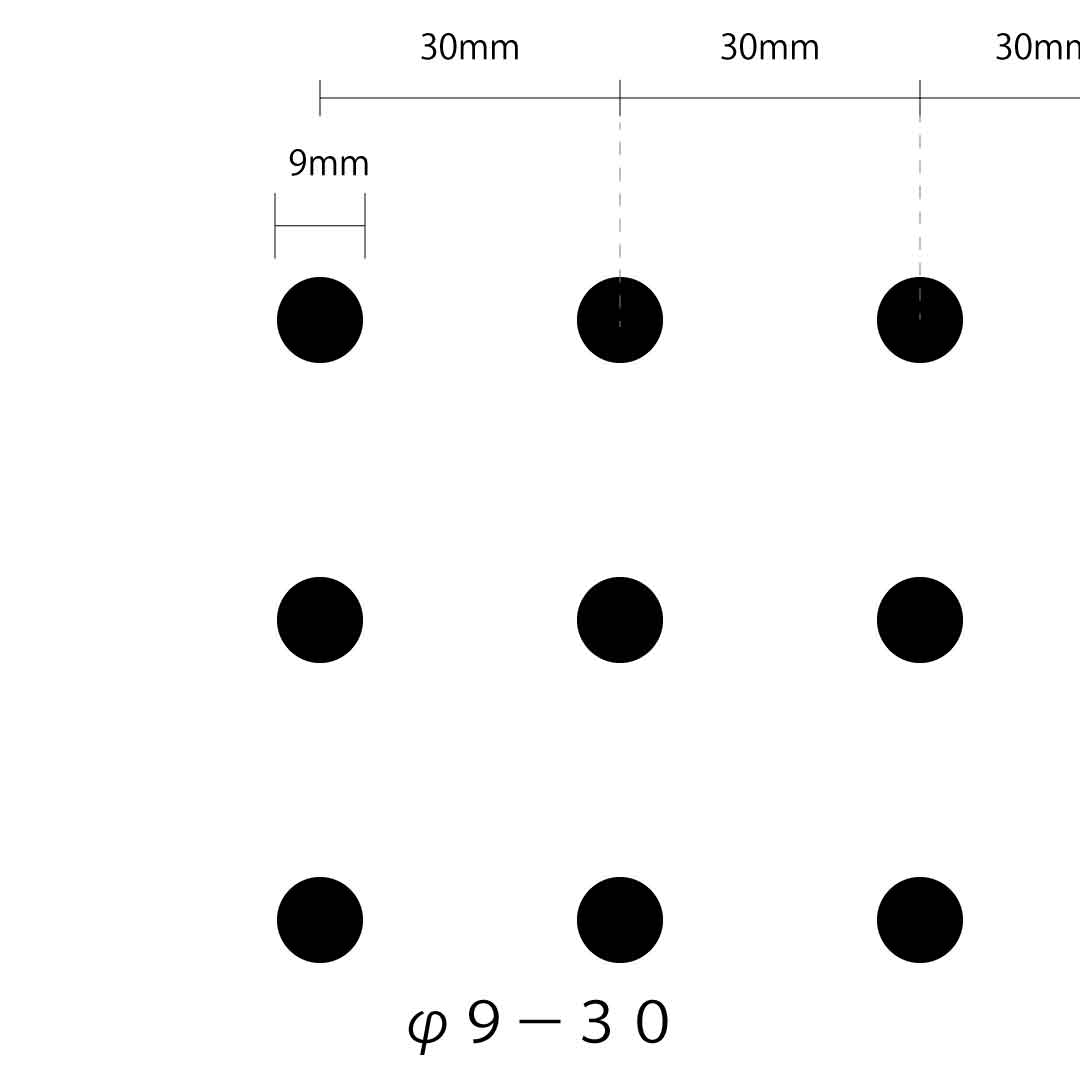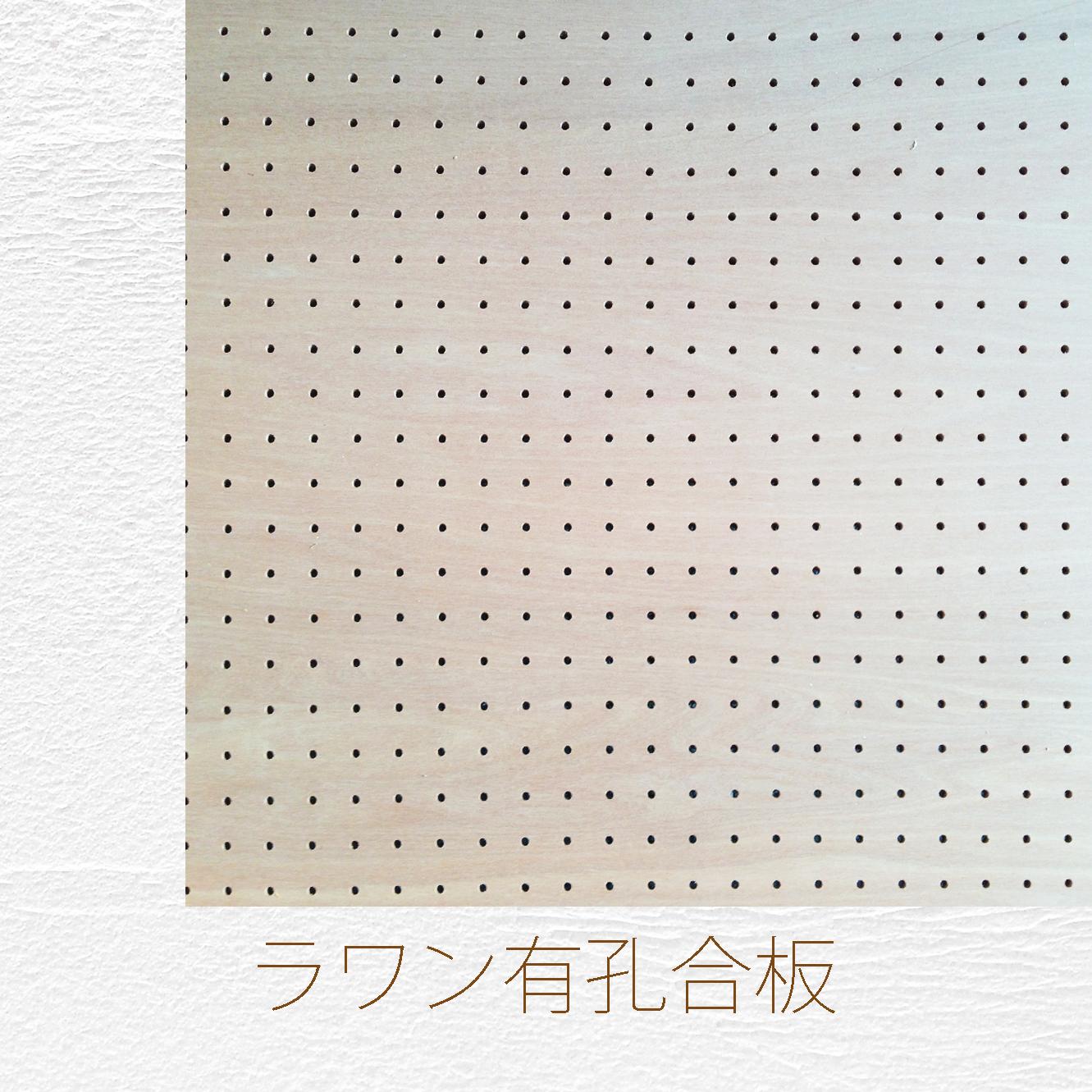 ラワン合板に、5mm、25mmピッチの穴が開いている合板。吸音効果があるほか、壁面収納やディスプレイなどにも使用されています。